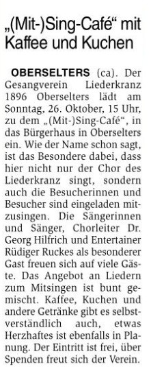 Bild: An den Noten bzw. elektrischem Klavier Chorleiter Dr. Georg Hilfrich (Rückenansicht) und mit dem Solisten (Bass) Hans Albert Demer (im Bild mittig vor dem Chor)